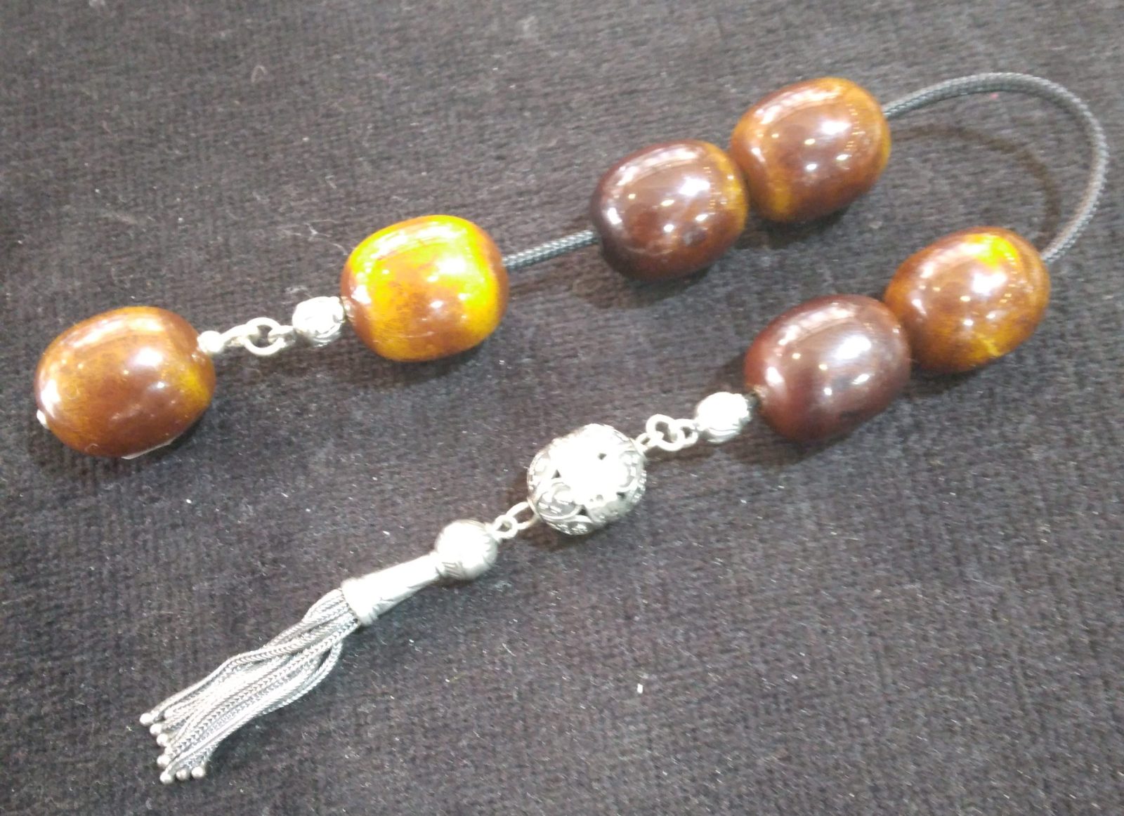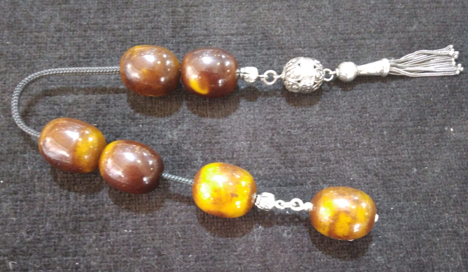 Μπεγλέρι με χάντρες κεχριμπάρι φατουράν και ασημένια φούντα.